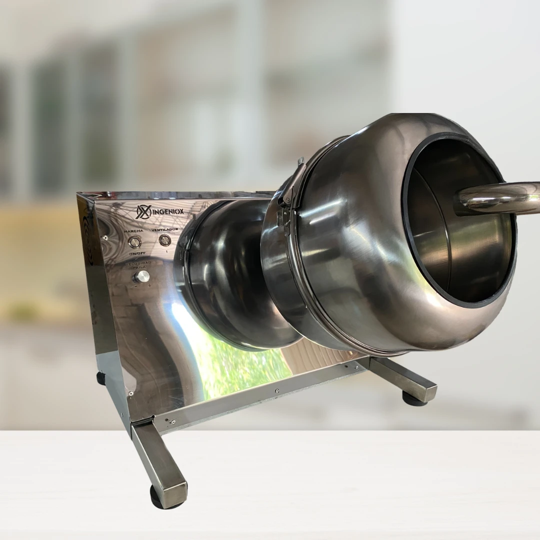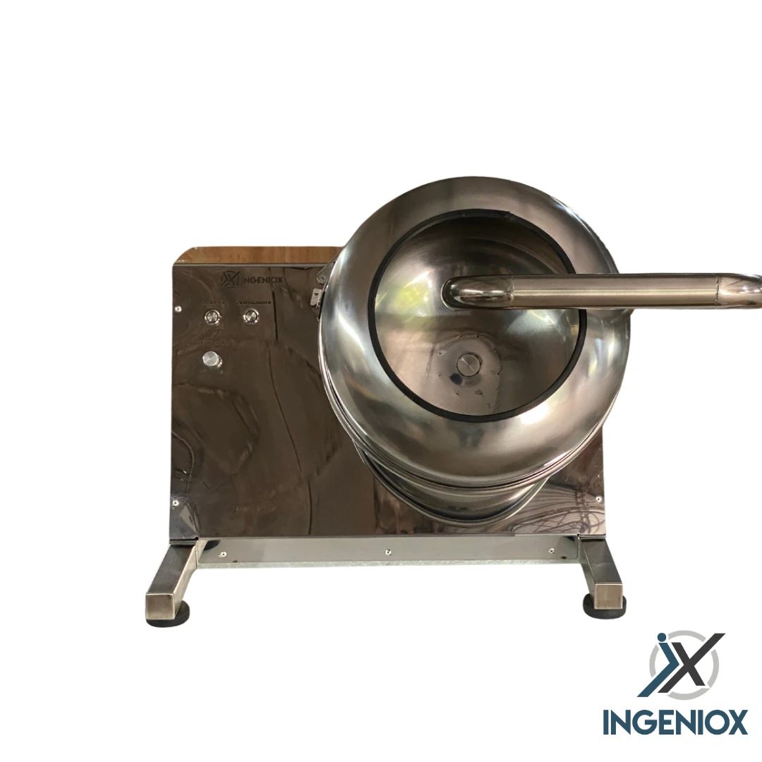 PAILA INDUSTRIAL: Este equipo puede procesar hasta 4 Kgr de producto (testeado base mani) Pudiendo trabajar en forma continua entre 4 y 6 Hs por grageado, segun las condiciones y variables aplicadas al prcoceso. Este modelo tiene velocidad de bombo fijas, en 35 RPM